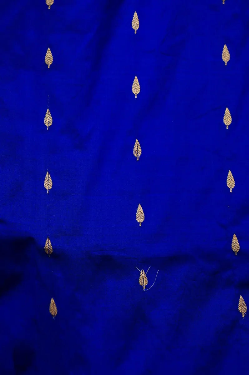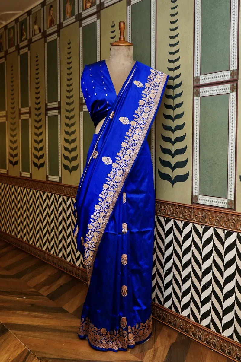 Saree Details : Saree Fabric: Pure Banarasi Single Katan Silk | Blouse Fabric: Pure Banarasi Single Katan Silk | Saree Work: Golden Zari Boota Blouse Work: Golden Zari Border With Booti Heavy Blouse | Saree Color: Royal Blue| Blouse Color: Royal Blue