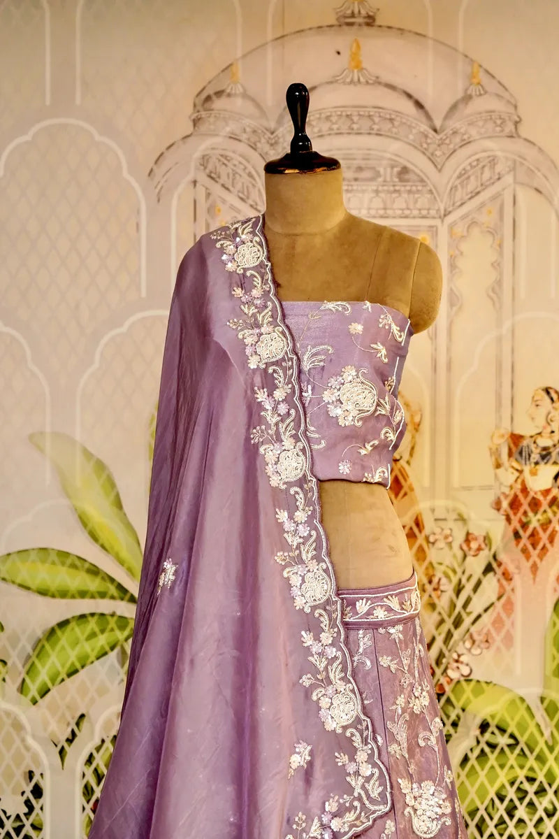 PURE GLASS TISSUE LAVENDER COLOR PARTY WEAR LEHENGA