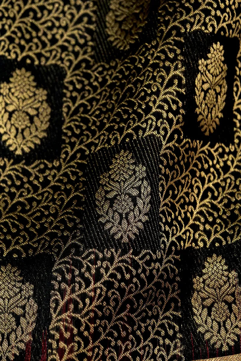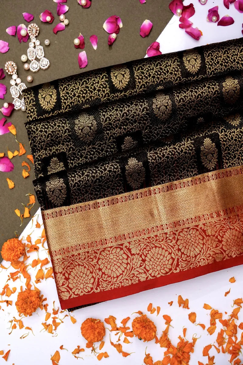 - Saree Details: Saree Fabric: Pure Handloom Kanchipuram Silk | Blouse Fabric: Pure Handloom Kanchipuram Silk | Saree Work: Shikargah Silk Design With Golden Zari Work & Golden Zari Border | Blouse Work: Plain & Maroon Color Golden Zari Border | Saree Color: Black With Maroon Contrast Color | Blouse Color: Black With Maroon Contrast Color |