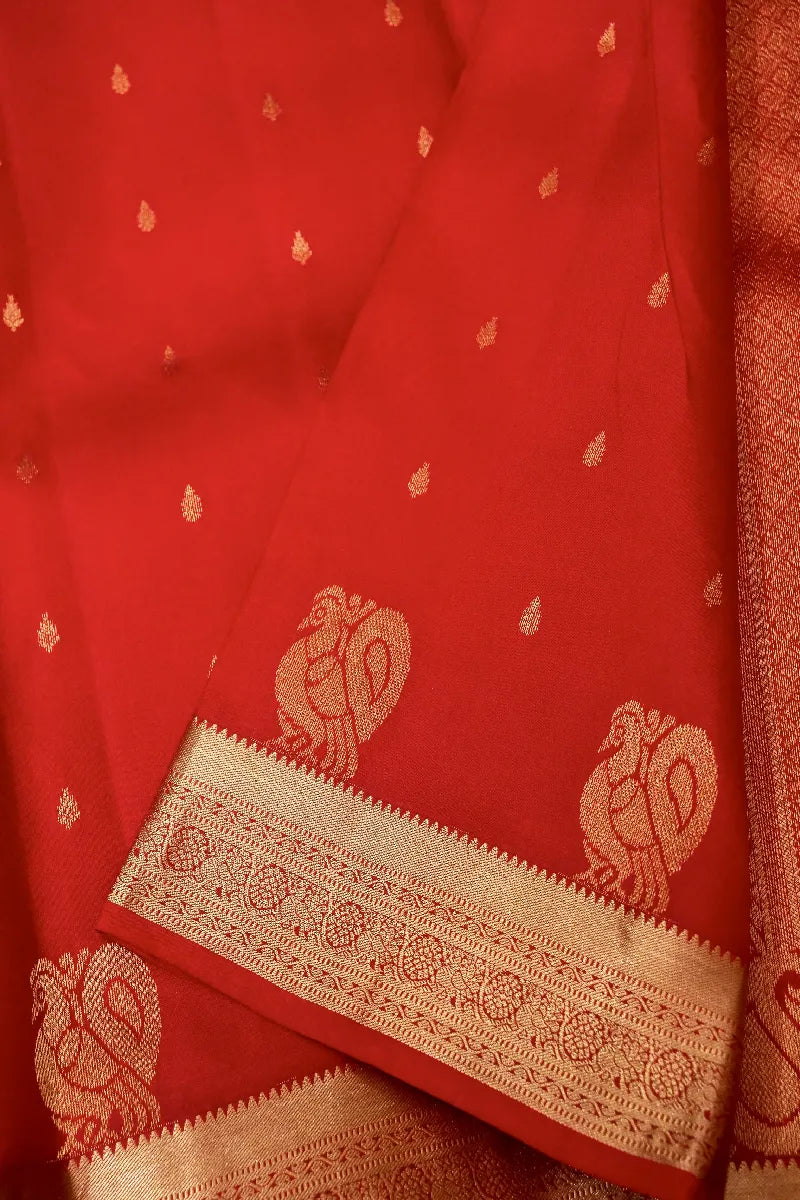 - Saree Details: Saree Fabric: Pure Handloom Kanchipuram Silk | Blouse Fabric: Pure Handloom Kanchipuram Silk | Saree Work: Zari Booti Design With Golden Zari Hand Weaving Work | Blouse Work: Plain Golden Zari Border | Saree Color: Blood Red Color | Blouse Color: Blood Red Color |