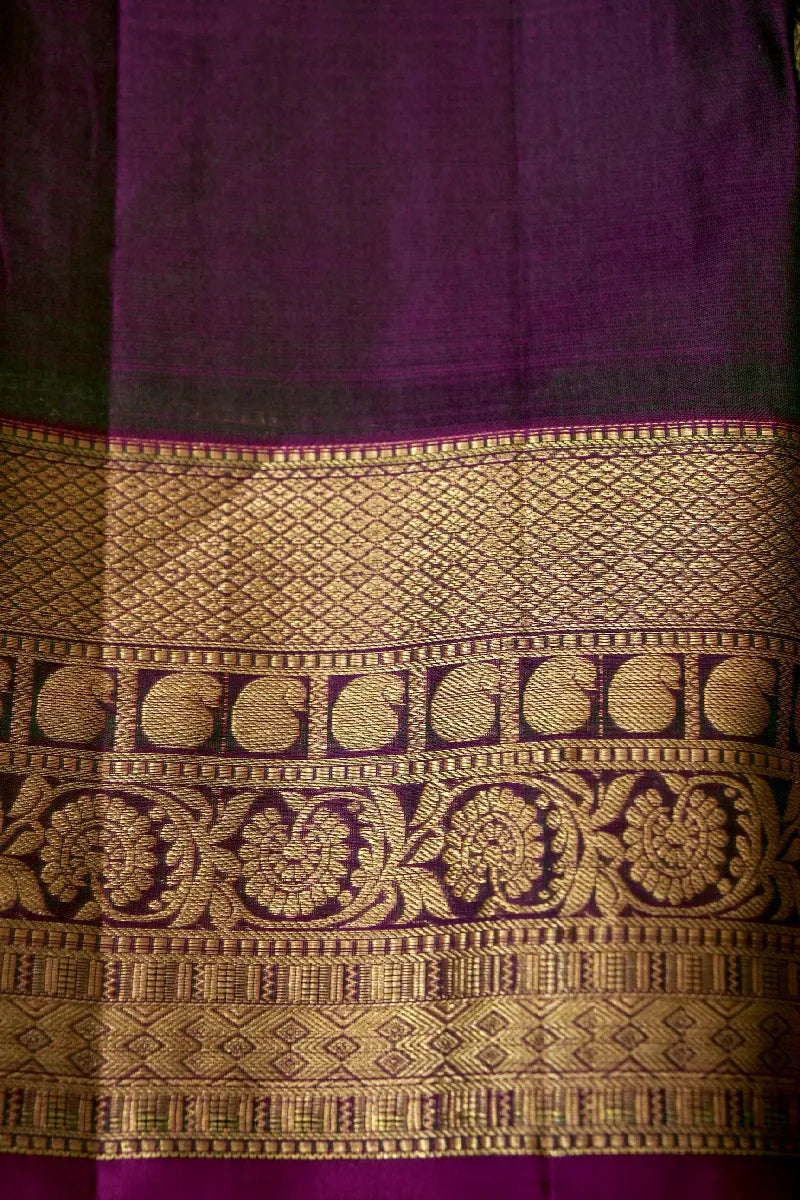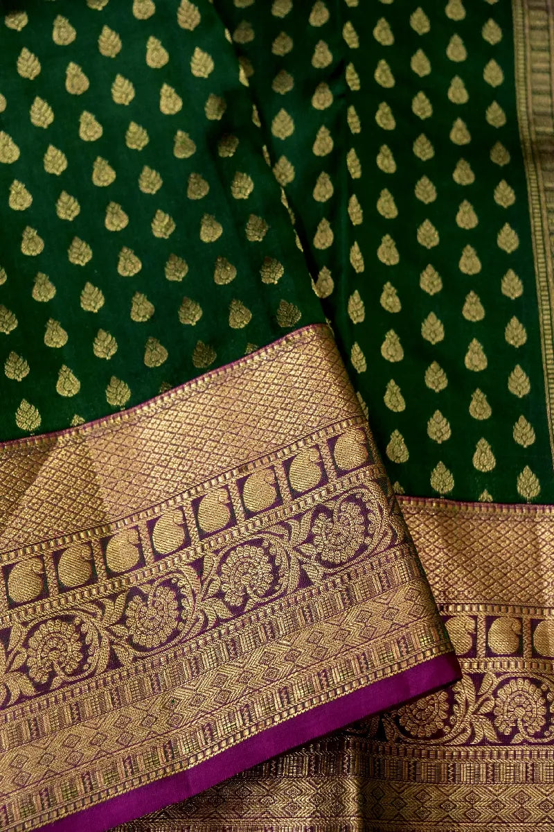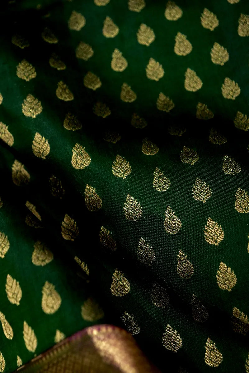 - Saree Details: Saree Fabric: Pure Handloom Kanchipuram Silk | Blouse Fabric: Pure Handloom Kanchipuram Silk | Saree Work: Butti Design With Golden Zari Work | Blouse Work: Golden Zari Butti Border | Saree Color: Bottle Green With Magenta Contrast Color | Blouse Color: Magenta Color |