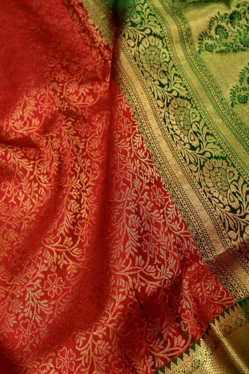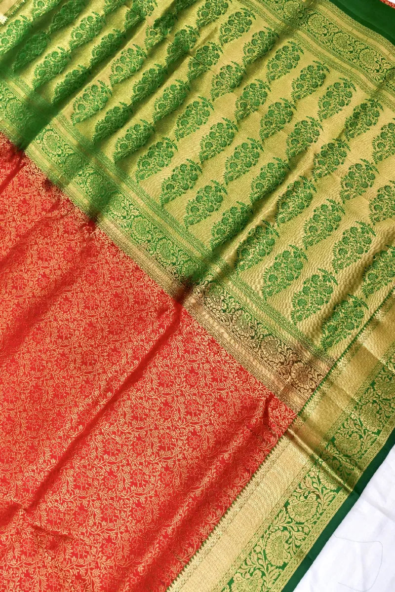 - Saree Details: Saree Fabric: Pure Handloom Kanchipuram Silk | Blouse Fabric: Pure Handloom Kanchipuram Silk | Saree Work: Brocade Silk Design Work With Golden Zari Work | Blouse Work: Plain & Golden Zari Border | Saree Color: Dark Brick With Contrast Green Color | Blouse Color: Green Color |