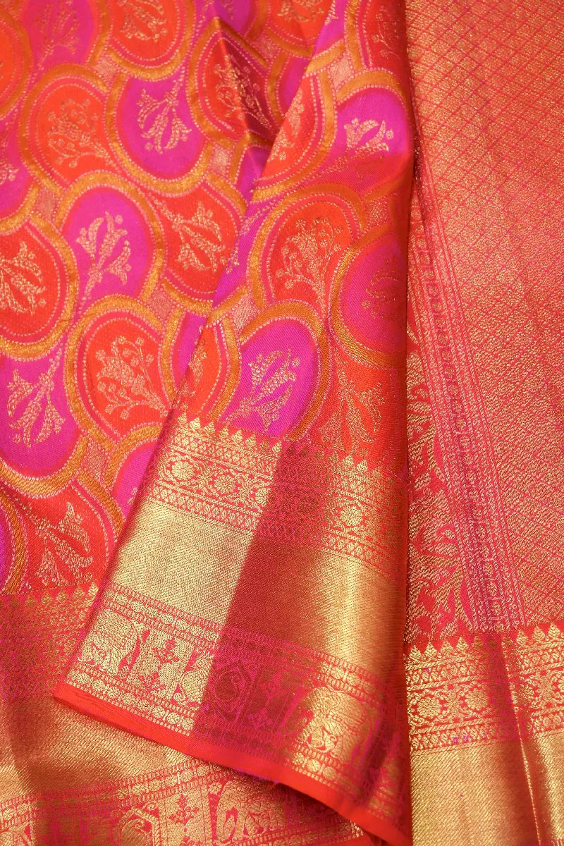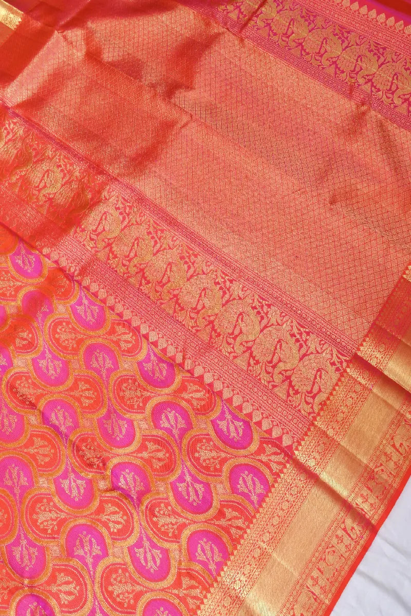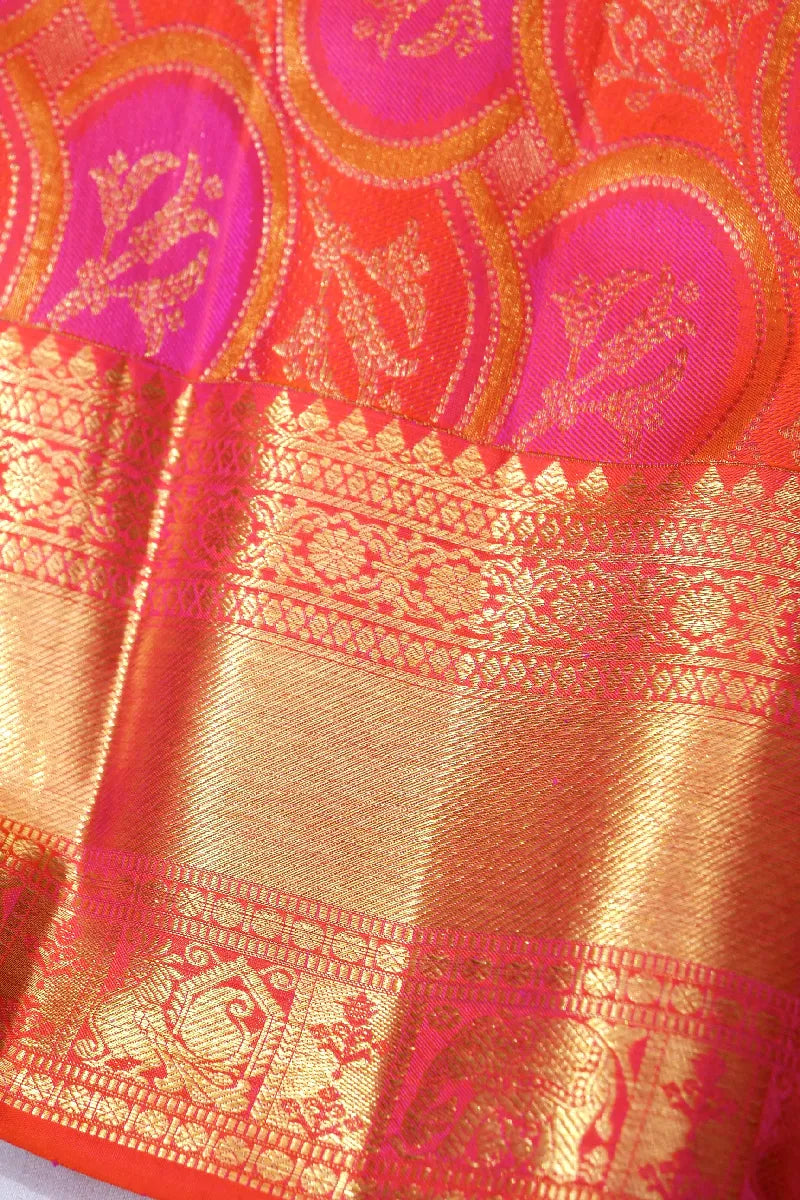- Saree Details: Saree Fabric: Pure Handloom Kanchipuram Silk | Blouse Fabric: Pure Handloom Kanchipuram Silk | Saree Work: Rangkat Saree Design With Golden Zari Work & Golden Zari Border | Blouse Work: Plain & Golden Zari Border | Saree Color: Gajari Pink Color | Blouse Color: Gajari Pink Color |