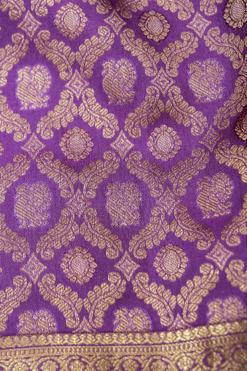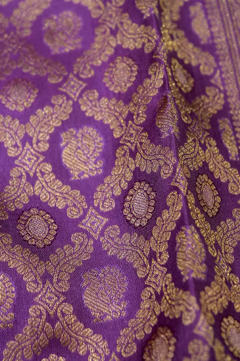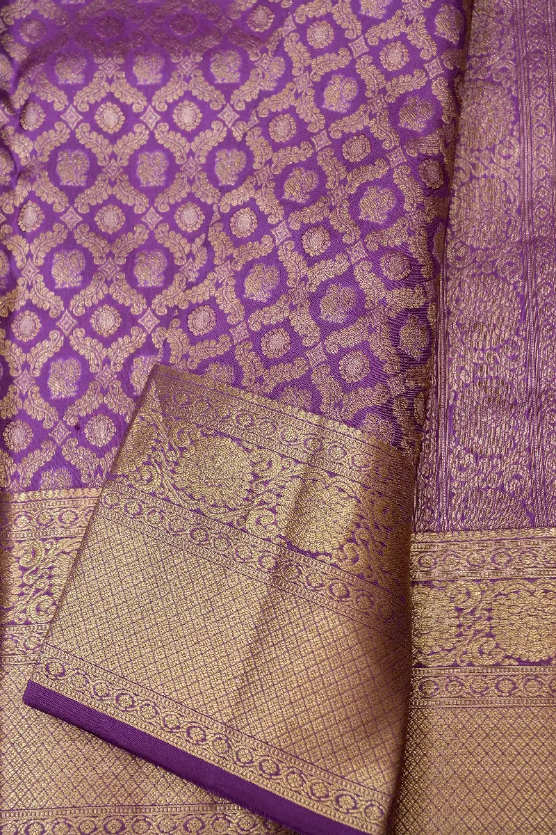 - Saree Details: Saree Fabric: Pure Handloom Kanchipuram Silk | Blouse Fabric: Pure Handloom Kanchipuram Silk | Saree Work: Habutai Zari Design With Golden Zari Work & Golden Zari Border | Blouse Work: Plain & Golden Zari Border | Saree Color: Lavender Color | Blouse Color: Lavender Color |