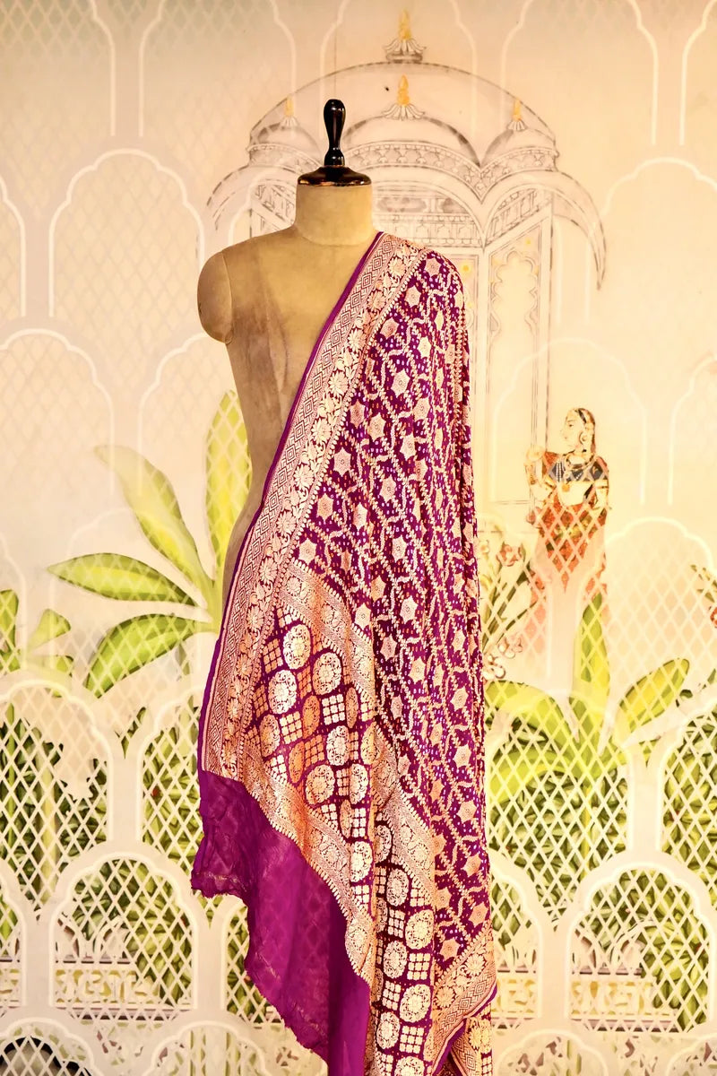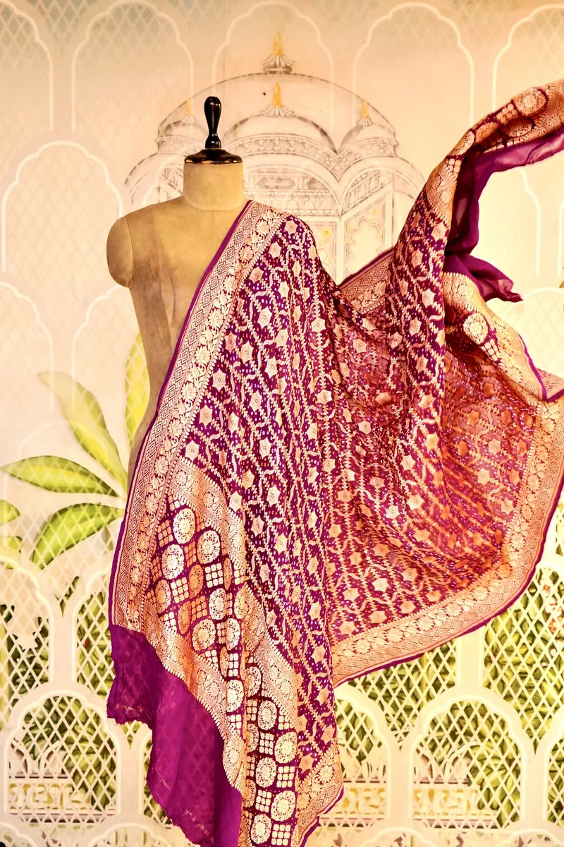 Dupatta Details :- Dupatta Fabric :- PURE HANDLOOM KHADDI BANDHANI (GEORGETTE) | Dupatta Work :- PURE HANDLOOM WITH ALL OVER JAAL GOLDEN ZARI HAND WORK & GOLDEN ZARI BORDER | Dupatta Color: PURPLE COLOR | Dupatta Length : Dupatta: 2.20 Mtr | Dupatta Width : Dupatta 1.1 Mtr |