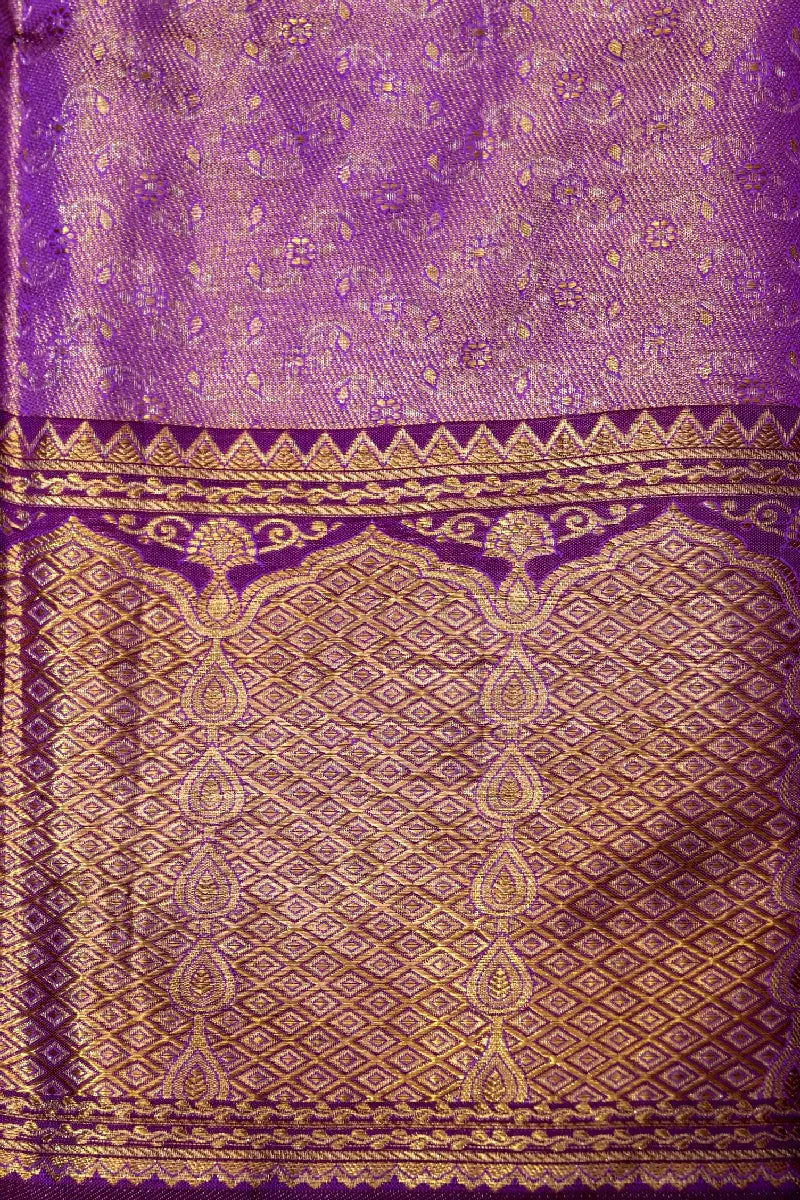 - Saree Details : Saree Fabric: Pure Handloom Real Zari Kanchipuram Silk | Blouse Fabric: Pure Handloom Real Zari Kanchipuram Silk | Saree Work: Brocket Silk Self Weaving Design With Golden Zari Work & Figure Concept Kalamkari Border | Blouse Work: Self Weaving Golden Zari Border | Saree Color: Golden Color With Kalamkari Border | Blouse Color: Dark Purple Color |