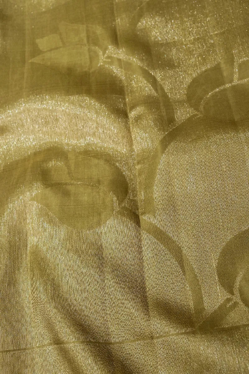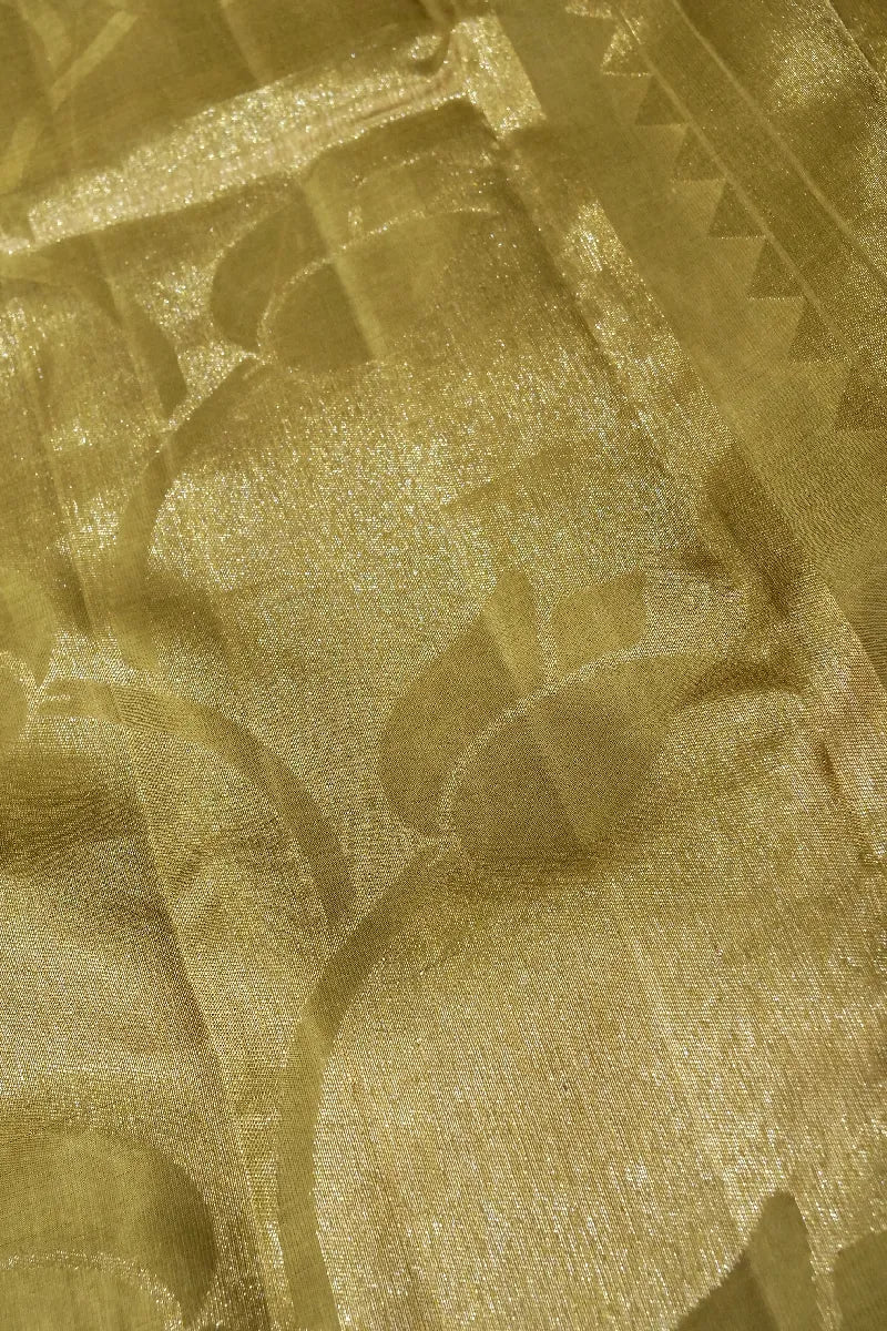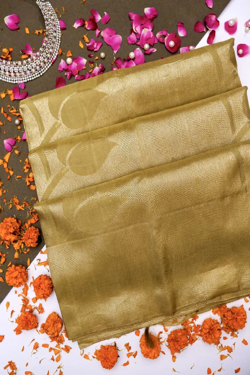 - Saree Details: Saree Fabric: Pure Handloom Real Zari Kanchipuram Silk | Blouse Fabric: Pure Handloom Real Zari Kanchipuram Silk | Saree Work: Lotus Pattern Design With Golden Zari Work & Zari Border | Blouse Work: Plain With Golden Zari Border | Saree Color: Mehndi Golden Color | Blouse Color: Mehndi Golden Color |