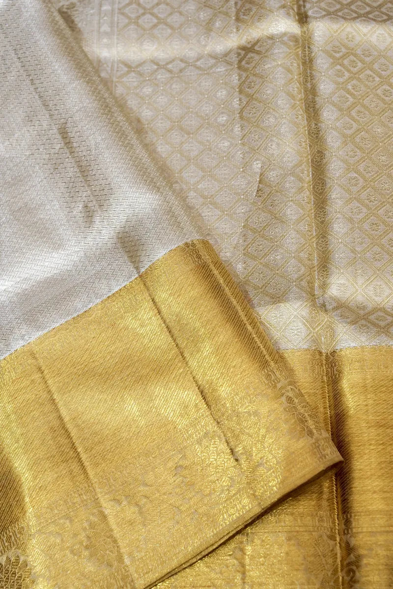 - Saree Details: Saree Fabric: Pure Handloom Kanchipuram Silk | Blouse Fabric: Pure Handloom Real Zari Kanchipuram Silk | Saree Work: All Over Zigzag Pattern With Golden Zari Hand Work | Blouse Work: Plain With Golden Zari Border | Saree Color: Silver With Golden Color | Blouse Color: Silver With Golden Color |