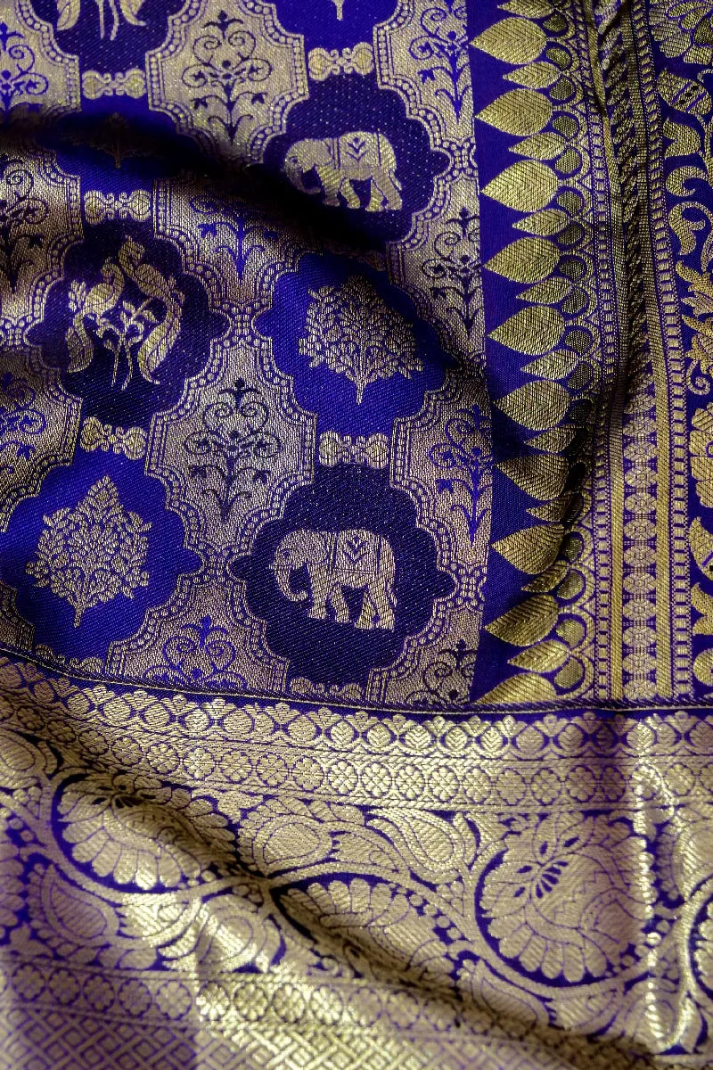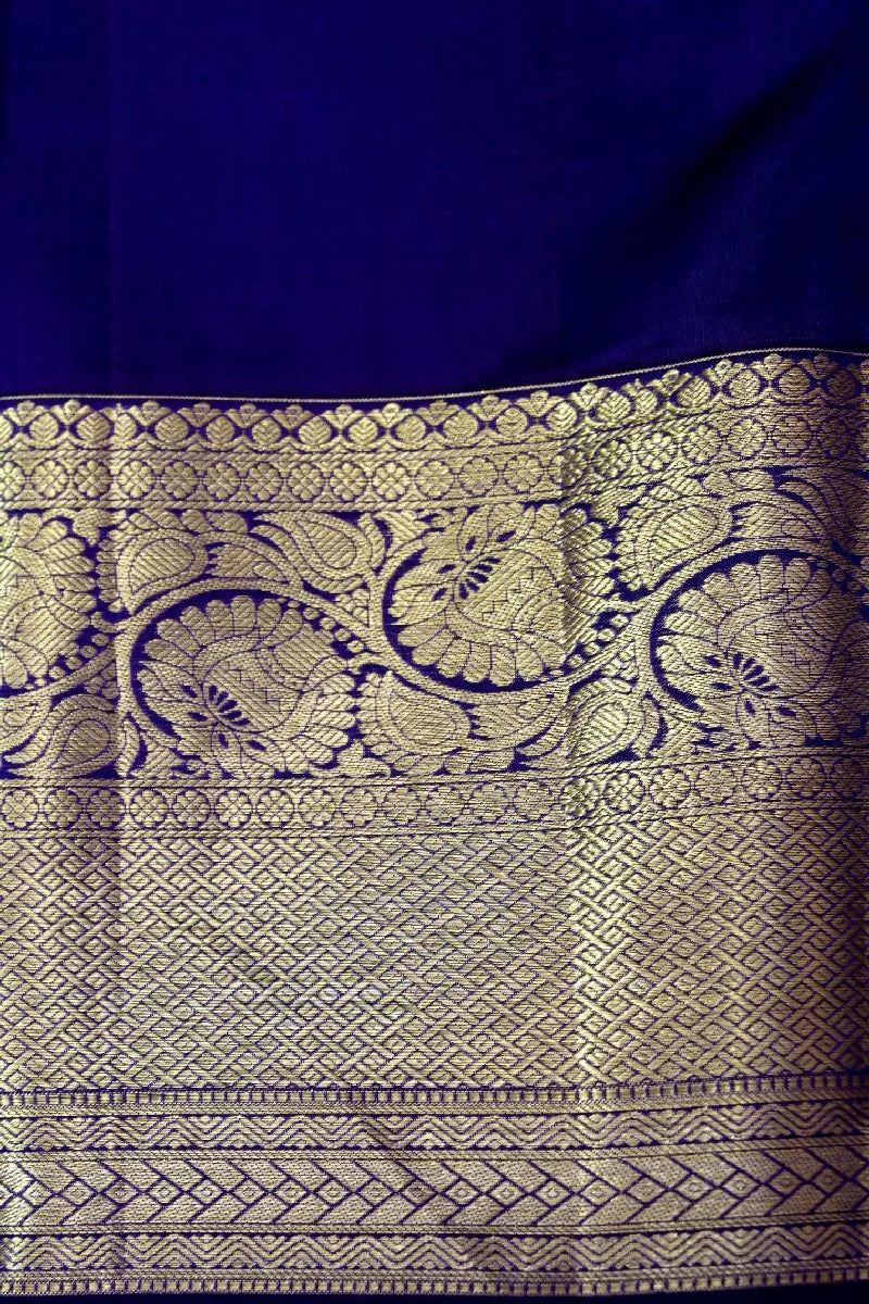 - Saree Details: Saree Fabric: Pure Handloom Kanchipuram Silk | Blouse Fabric: Pure Handloom Kanchipuram Silk | Saree Work: Shikargah Saree Design With Golden Zari Work | Blouse Work: Plain & Golden Zari Border | Saree Color: Royal Navy Blue Color | Blouse Color: Royal Navy Blue Color |