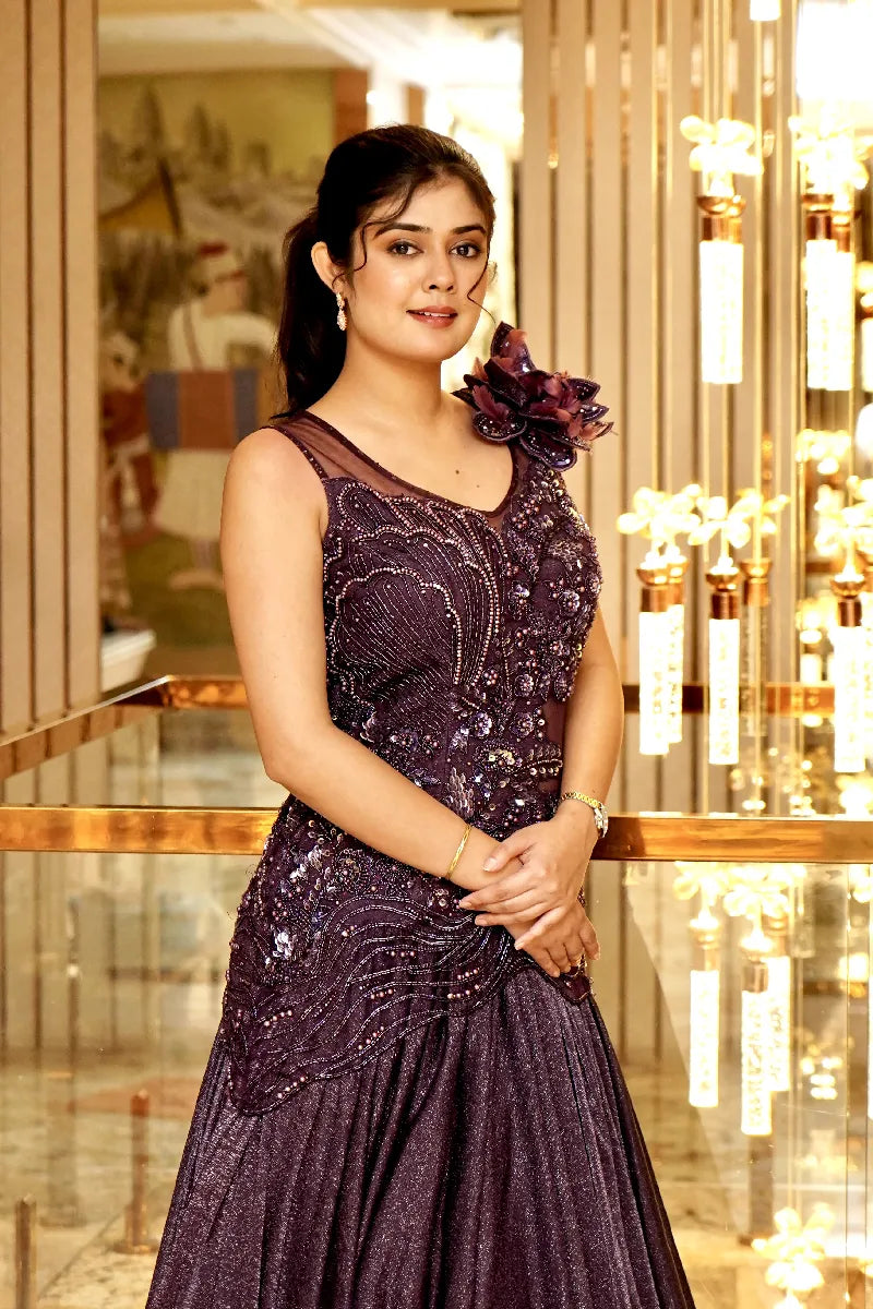 Work:- Purple Color Gown Pearl Sequence Handwork