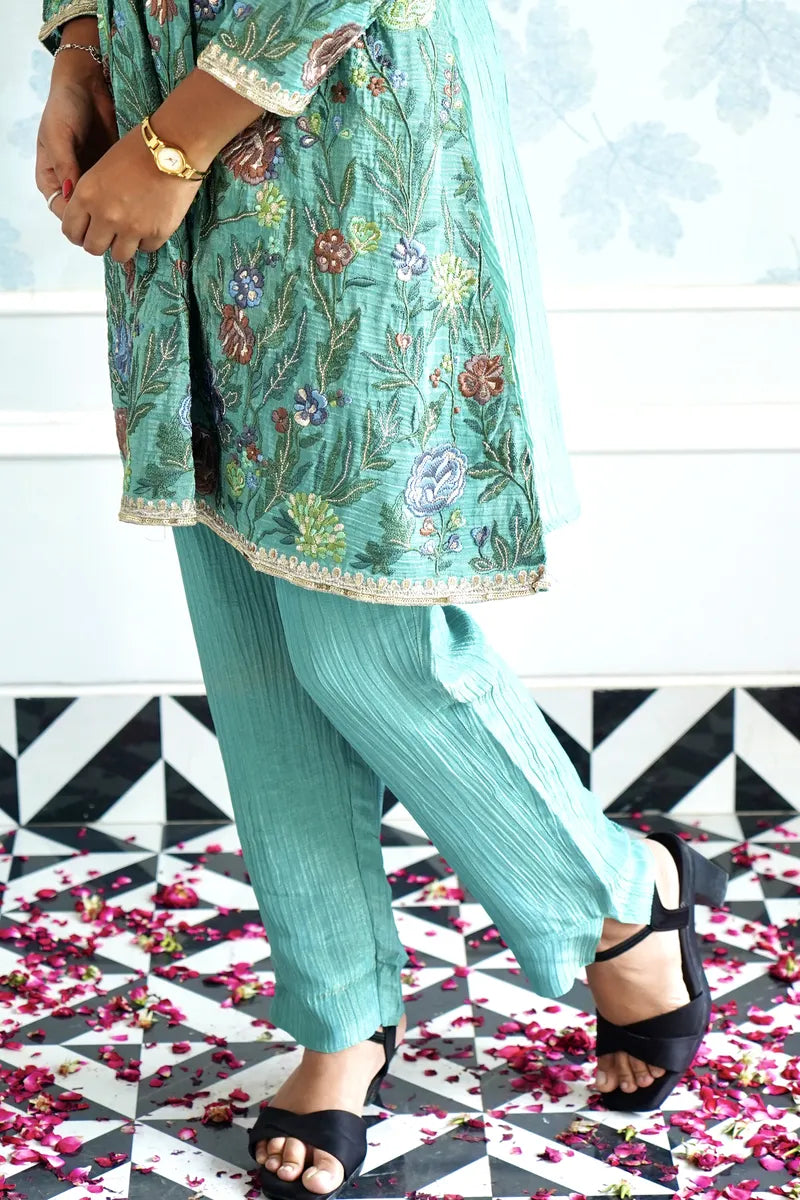 MEADOW MIST EMBROIDERED KURTA SET IN TEAL GREEN