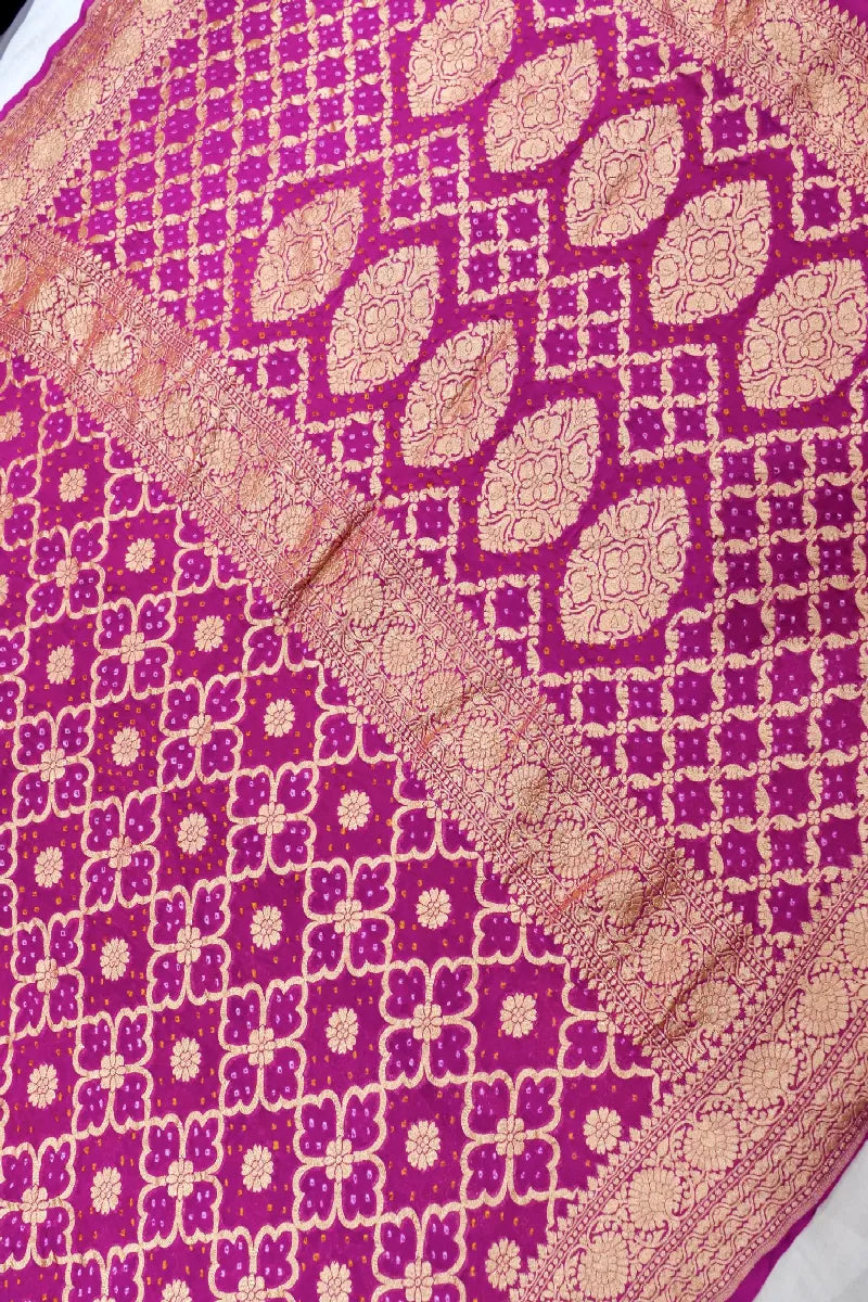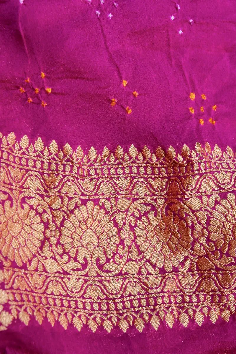 - Saree Details :Saree Fabric: Pure Handloom Khadi Georgette Bandhani | Blouse Fabric: Pure Handloom Khadi Georgette Bandhani | Saree Work: Hand Woven Golden Zari Jaal Work | Blouse Work: Bandhani Print With Golden Zari Border | Saree Color: Rani Pink | Blouse Color:Rani Pink