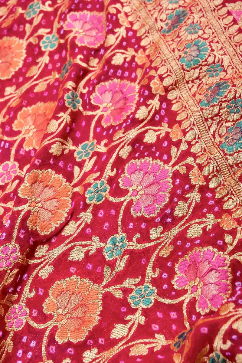 FLORAL FIESTA: RANI PINK KHADDI GEORGETTE BANDHANI SAREE WITH MULTICOLOR JAAL AND ZARI BORDER