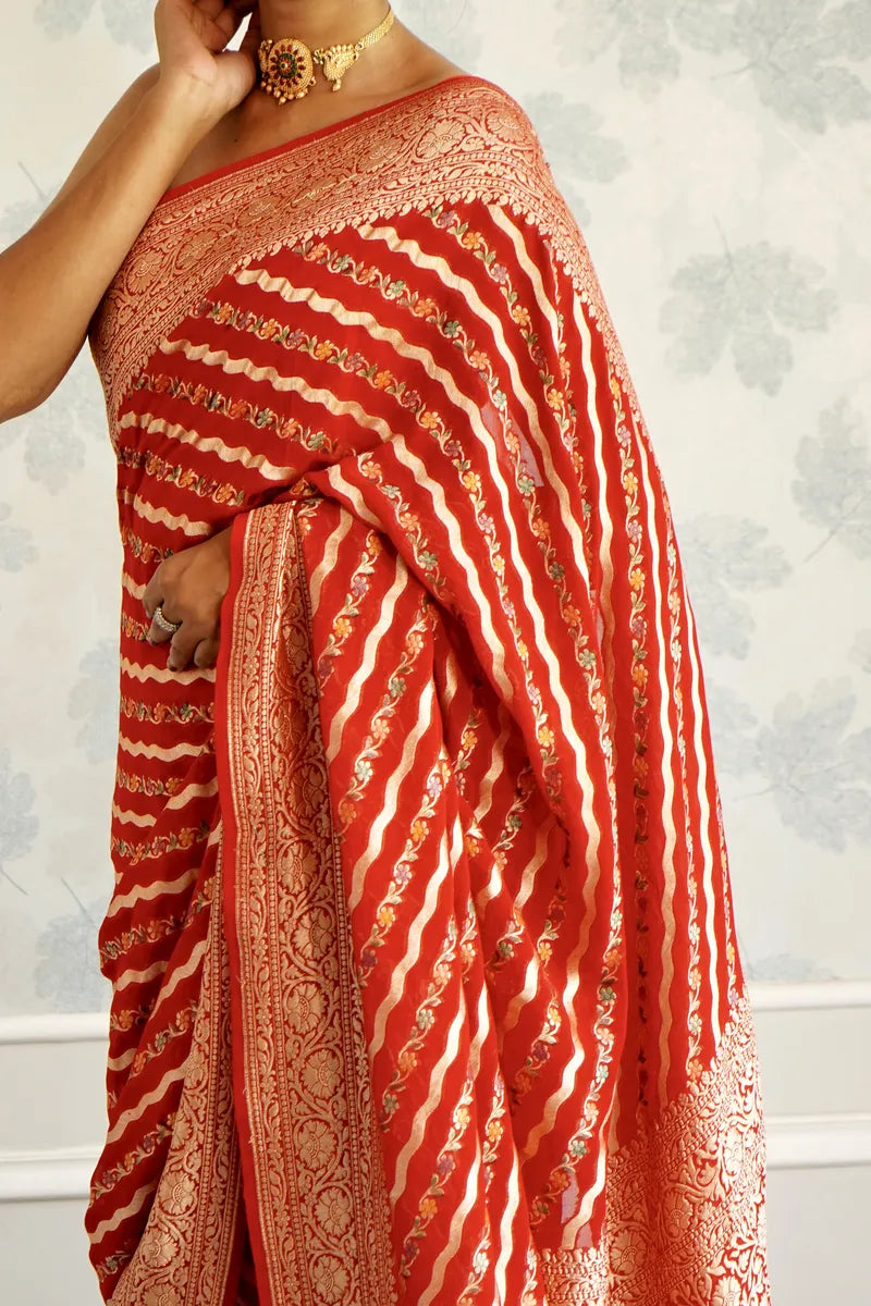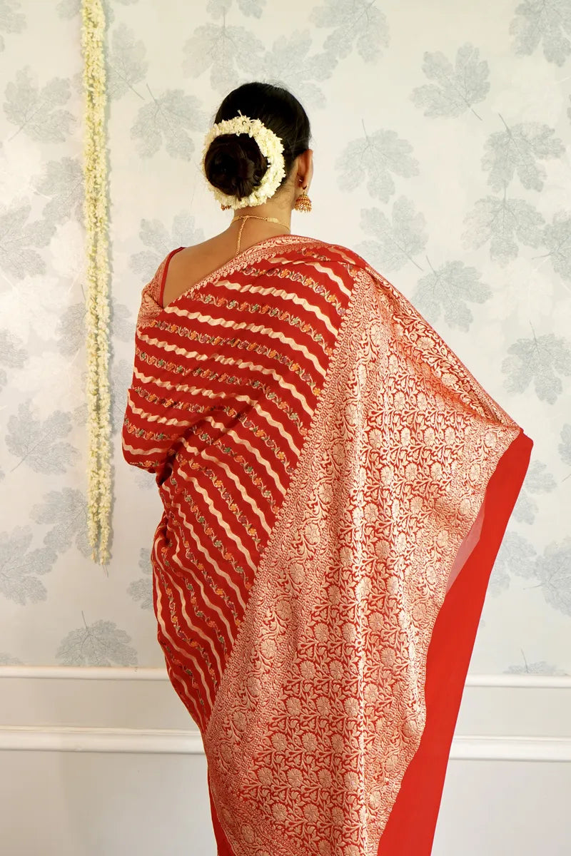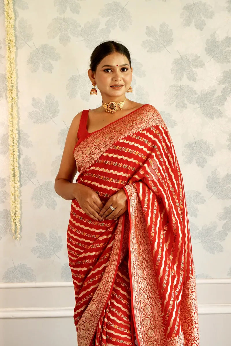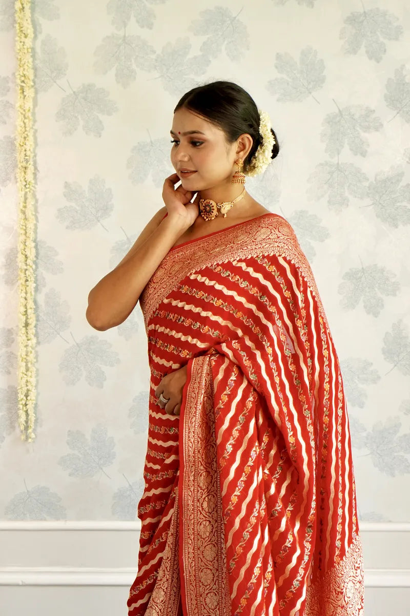 - Saree Details : Saree Fabric: Pure Handloom Khaddi | Blouse Fabric:Pure Handloom Khaddi | Saree Work:Neem Zari With Meenakari Leheriya Design Handwork Border| Blouse Work Plain Handwork Border Saree Color Red Color| Blouse Color:Red Color