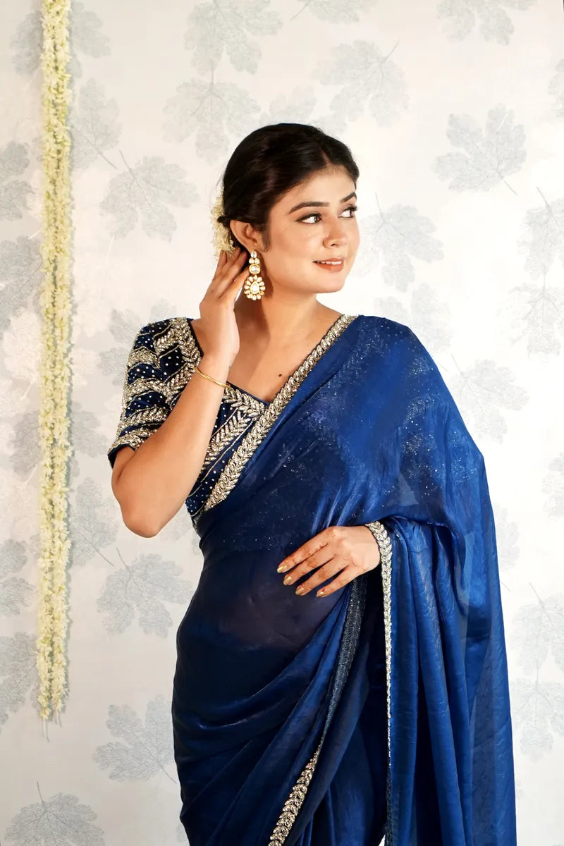 - Saree Details : Saree Fabric: Crepe Silk | Blouse Fabric:Crepe Silk | Saree Work:Plain Saree With Cutdana Stone Handwork Border| Blouse Work :| Heavy Stitched Cutdana Stone Handwork Border Saree Color:Rich Blue| Blouse Color:Rich Blue