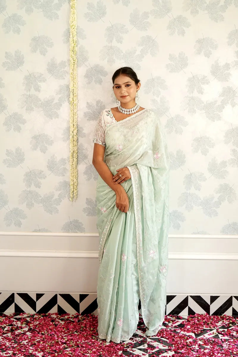 - Saree Details : Saree Fabric: Crepe | Blouse Fabric:Crepe Silk | Saree Work:Cutdana With Sequence Pearls Handwork Border| Blouse Work Cutdana Pearls Sequence Handwork Border Saree Color:Sea Green Color| Blouse Color:Sea Green Color