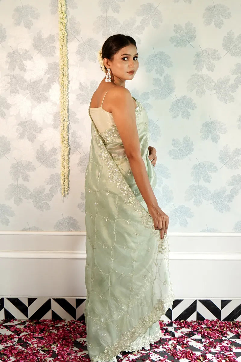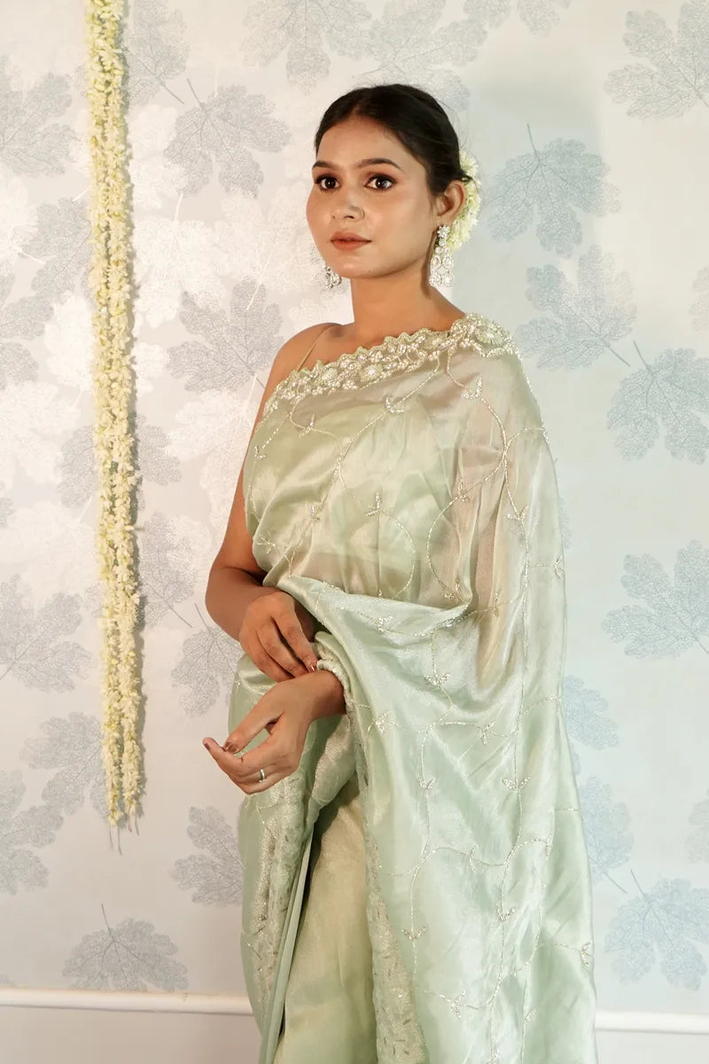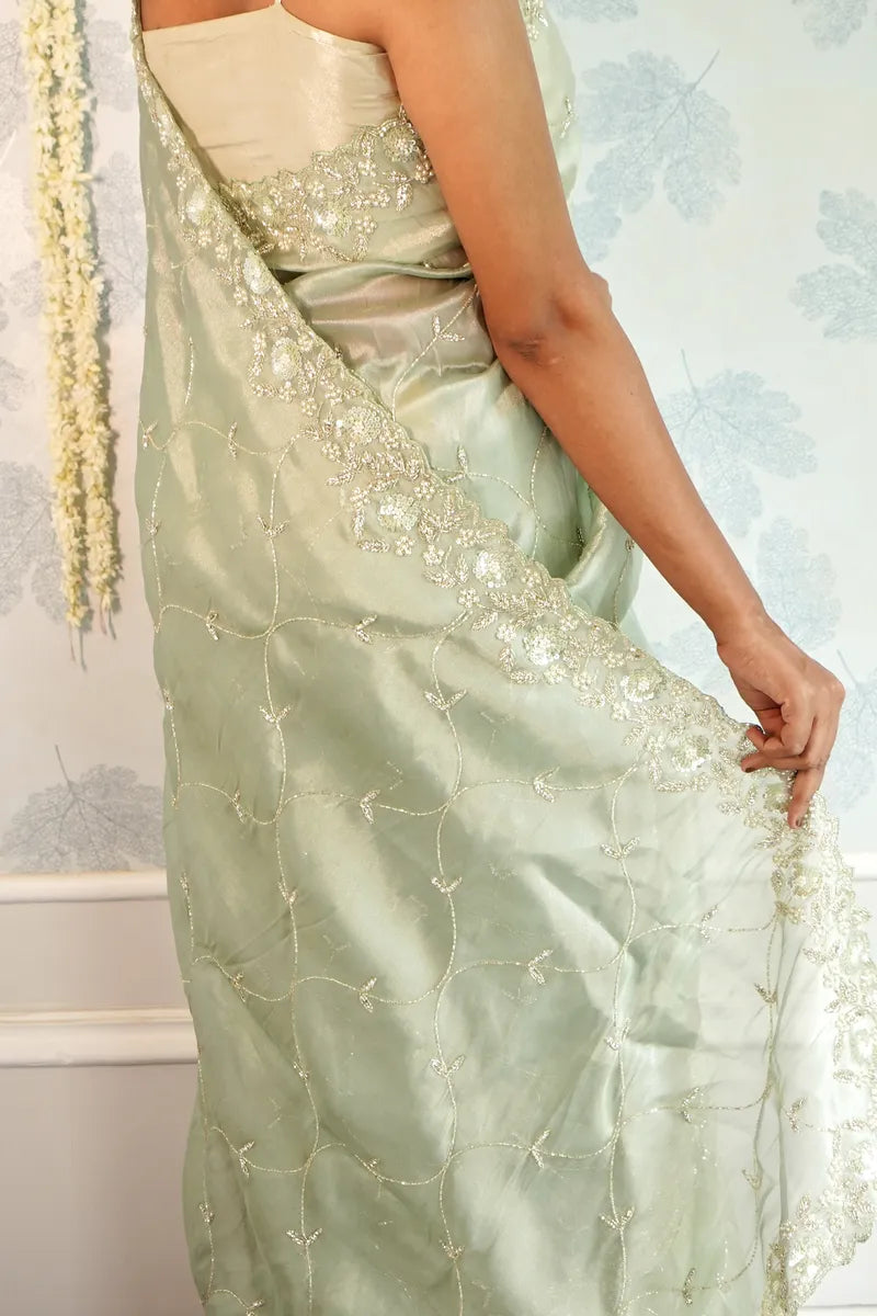 - Saree Details : Saree Fabric: Organza Silk | Blouse Fabric:Organza Silk | Saree Work:Cutdana Pearls Tikki Sequence Handwork Border| Blouse Work Cutdana Pearls Tikki Sequence Handwork Border Saree Color Sea Green Color | Blouse Color:Sea Green Color