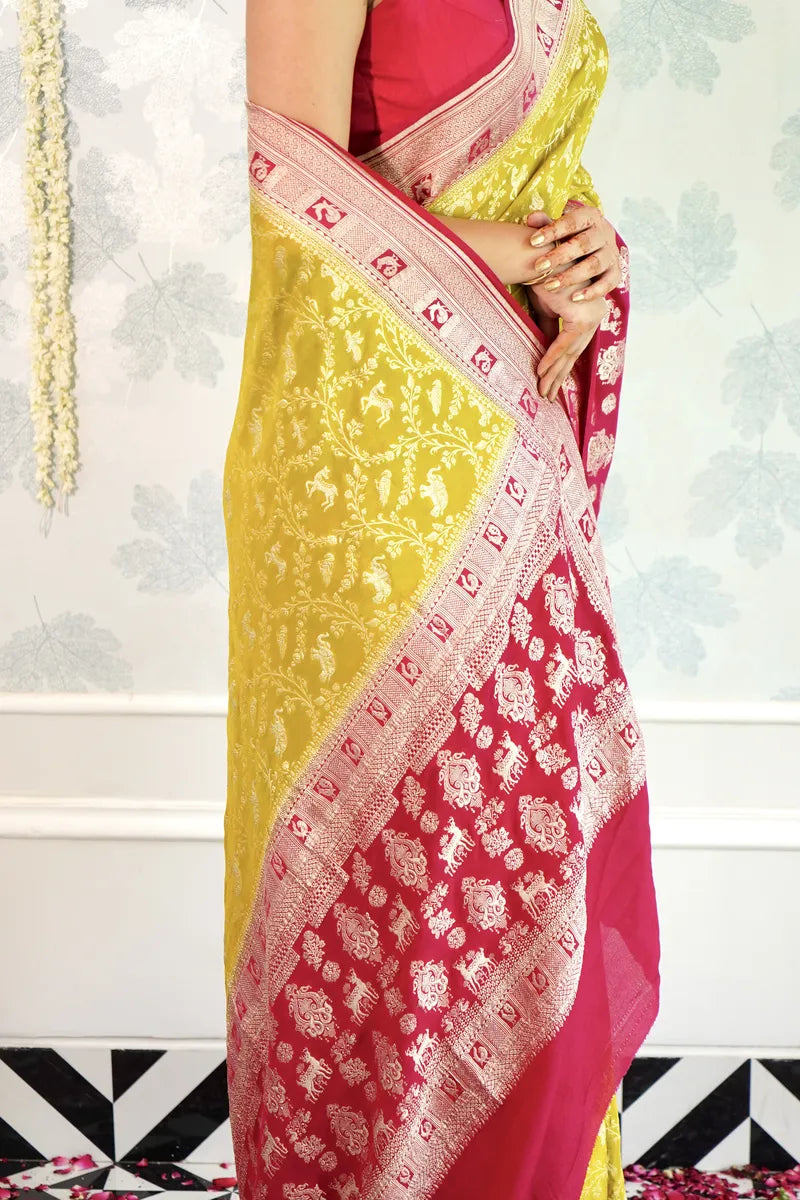 RADIANT ELEGANCE: MUSTARD YELLOW & PINK HANDWOVEN KHADDI GEORGETTE SAREE