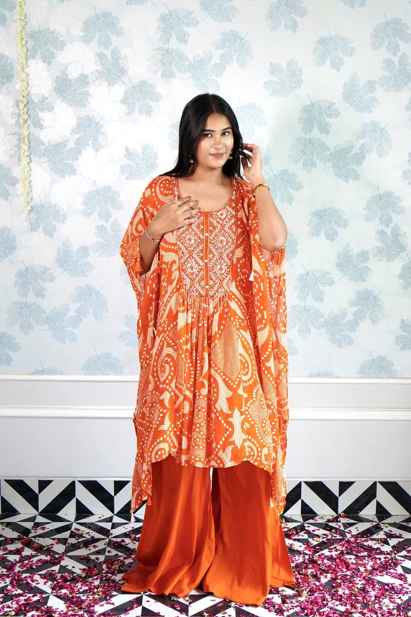 Top Fabric : Chiffon | Top Color : Orange | Top Work : Katdana Sequence Work With Print