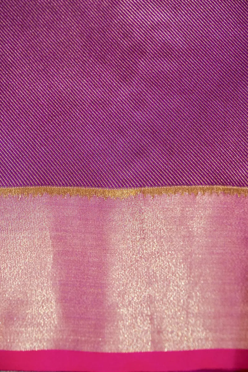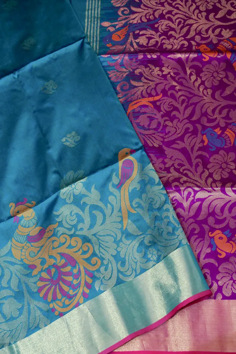 Saree Details: Saree Fabric: Banarasi Silk | Blouse Fabric : Banarasi Silk | Saree Work: Scout Pattern & Figure Concept Design With Resham & Golden Zari Hand Work | Blouse Work: Plain With Golden Zari Border | Saree Color: Til Blue With Purple Color | Blouse Color: Purple Color |