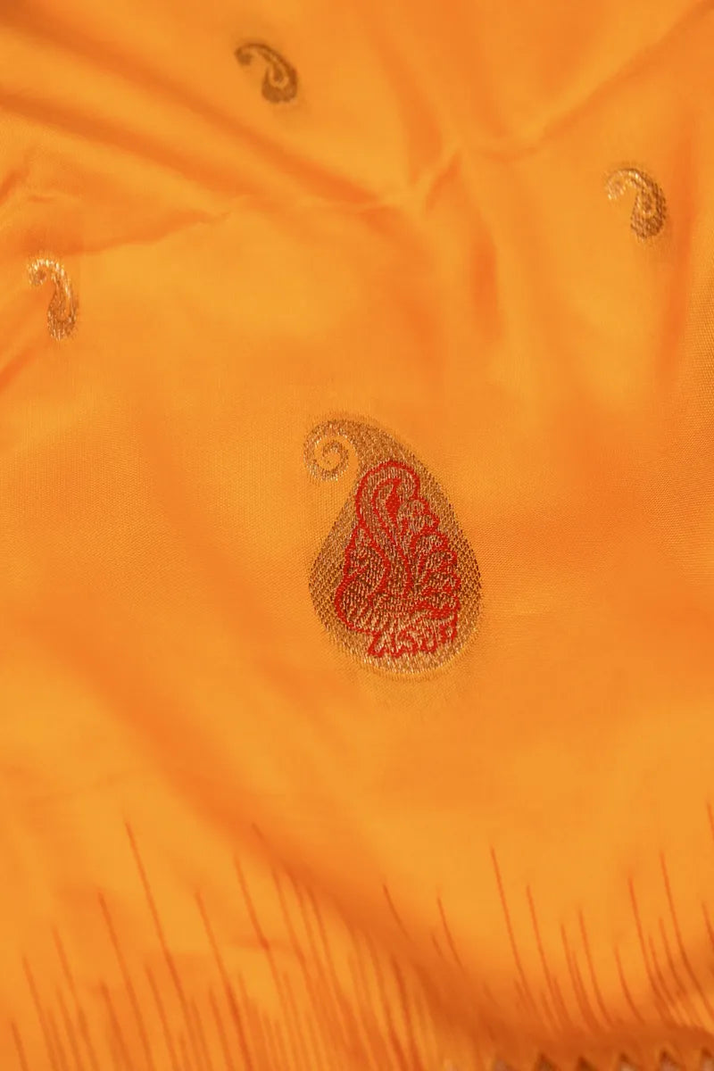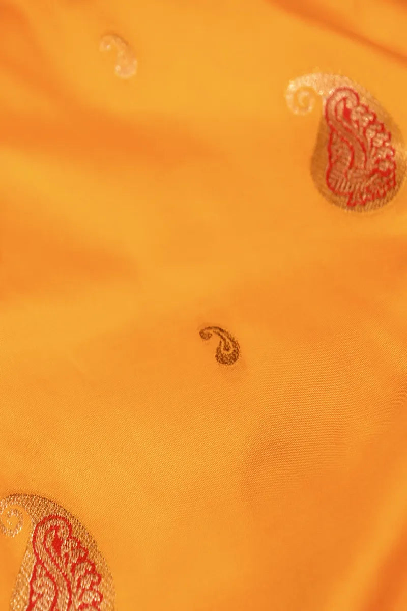 Saree Details : Saree Fabric : Banarasi Silk | Blouse Fabric : Banarasi Silk | Saree Work : All Over Karyi Buti & Figure Concept With Red Color Contrast Golden Zari Border | Blouse Work : Plain With Golden Zari Border | Saree Color : Yellow With Red Border | Blouse Color : Yellow With Red Border |